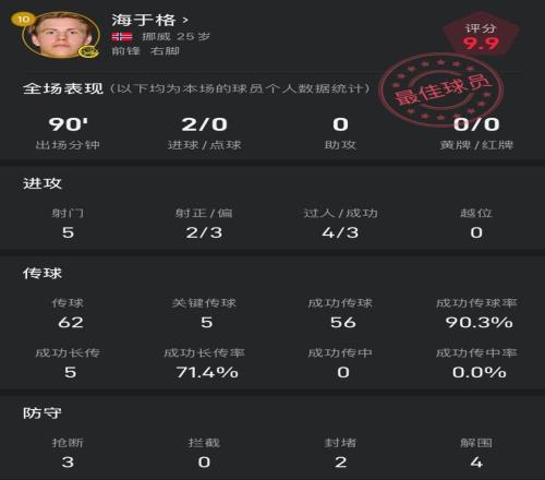 海于格本场数据:打入2球,媒体评分高达9.9