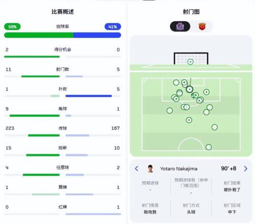 广岛三箭看似场面占优,但全场比赛也只是获得了2次绝佳得分机会(都是角球进攻)。他们在阵地战里,无法有效撕开上海海港的防线,关键点是他们的的进攻主要从上港的右路发起。