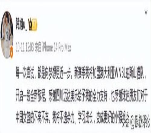 根据韩旭的社媒发文:新赛季我将加盟澳大利亚WNBL珀斯山猫队,开启一段全新旅程。