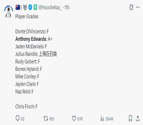 森林狼媒体也表态这支森林狼除了华子是A+外,其余的人都是F,就连主帅芬奇都是F,这支球队的阵容非常糟糕,朱利叶斯-兰德尔更是F都没有用中文写的“上海男篮在召唤”。