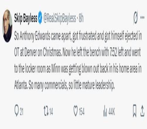 名嘴斯利普-贝勒斯也朝着爱德华兹开炮:年终大战对阵掘金华子就情绪失控、心态爆炸被直接驱逐。此役在亚特兰大老家被家乡球队胖揍,在末节还剩7分52秒提前离场,各种商业代言接不断,领袖担当却看不到。