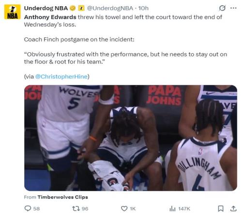 在第四节还剩7分52秒芬奇投降换下主力们后,爱德华兹非常愤怒的摔了毛巾,随后爱德华兹直接走进了更衣室离场了。