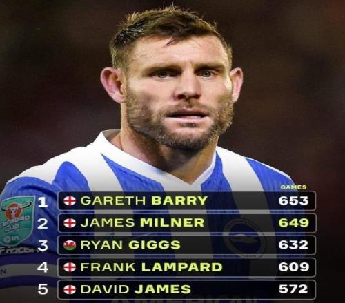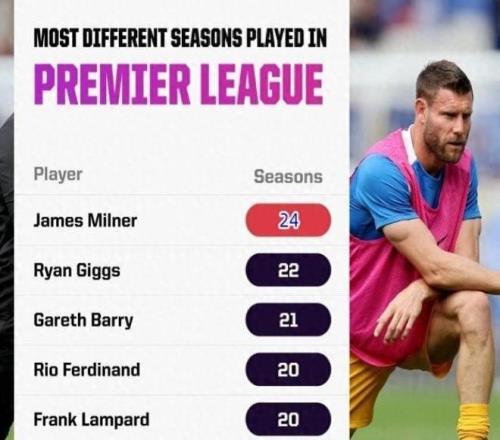 在英超赛场上踢了25个自然年,40岁的米尔纳距离英超历史出场王仅一步之遥!