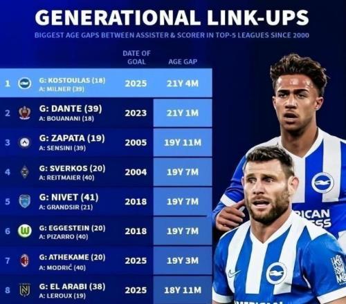 进球本身并未改变比赛结果,却创造了欧洲五大联赛前无古人的纪录。21年4个月的年龄差,这个“一老一少”的连线组合,成为五大联赛历史上年龄差最大的进球组合。命运的安排有着奇妙的对称感,当2002年11月10日,16岁的米尔纳身披利兹联战袍打进英超处子球时,他如今助攻的这位年轻队友,甚至尚未降临人世。