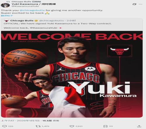 北京时间1月7日上午,芝加哥公牛官方宣布:球队用双向合同签下日本后卫河村勇辉。河村勇辉转发并写道:“感谢公牛再次给我机会,非常兴奋能够回来。”为了给河村勇辉腾位置,今天公牛裁掉双向合同球员特伦廷-弗劳尔斯。