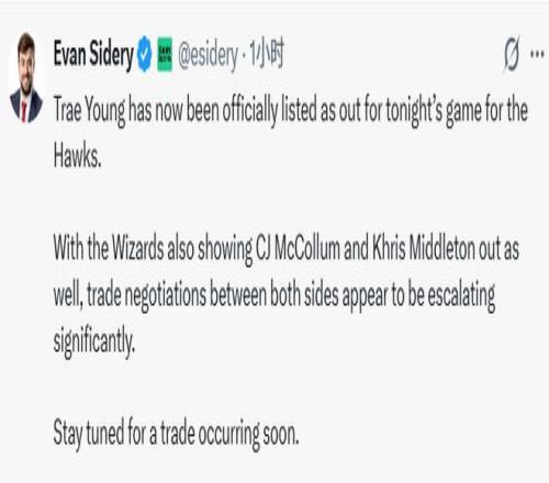 Sidery还表示,一笔交易或将很快达成。奇才的麦科勒姆和米德尔顿这两位老将均持有大额到期合同,这将有助于促成奇才与老鹰关于特雷-杨的交易谈判,使薪资匹配更具可行性。