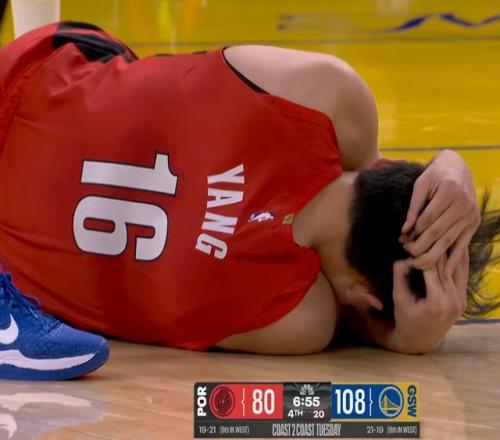 当然这场球最终也如大家所愿提前进入了垃圾时间,杨瀚森有比较长的时间可以登场。没想到杨瀚森就打了两个回合,就在一次倒地传球中后脑勺撞到了对手的膝盖,提前回到了更衣室。