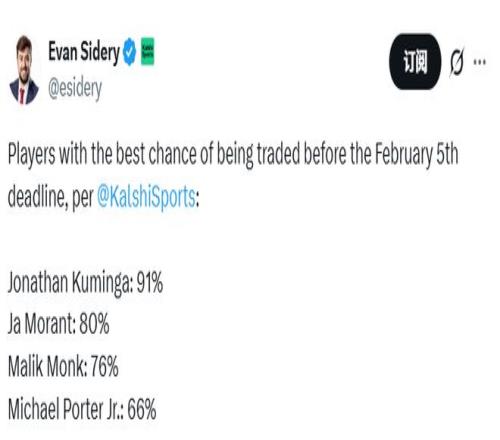 根据Kalshi Sports的数据,库明加的最新交易概率达到91%,高居榜首。他在本赛季早些时候几乎完全跌出了勇士的轮换阵容,自12月19日后便再未登场。如果湖人最终将他列为引援目标,他们将寄望于全新的环境和更多的出场时间,能帮助库明加在其NBA生涯第五个赛季的下半程找回状态、迎来反弹。