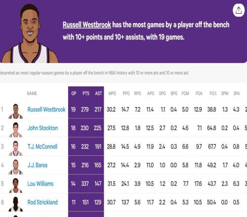 威少拿到生涯第19次替补10+分&10+助攻两双,独享历史第一